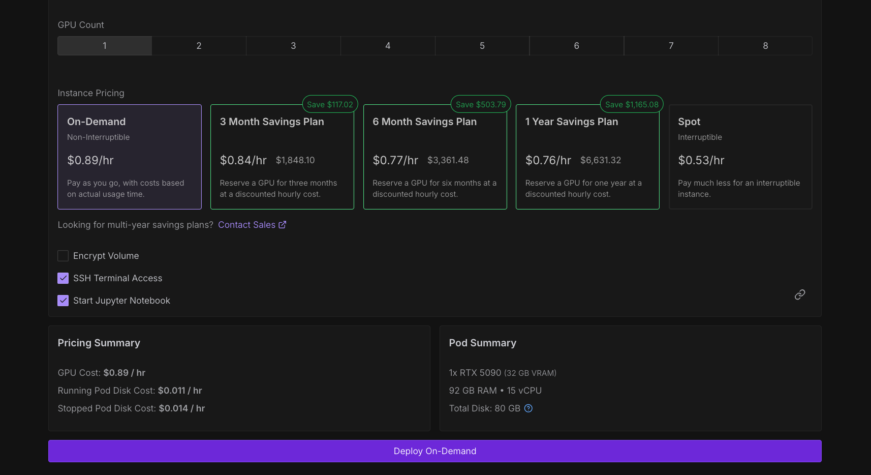 - 6 month savings plan: Deploys your Pod with a 6-month upfront commitment for even greater discounted rates.